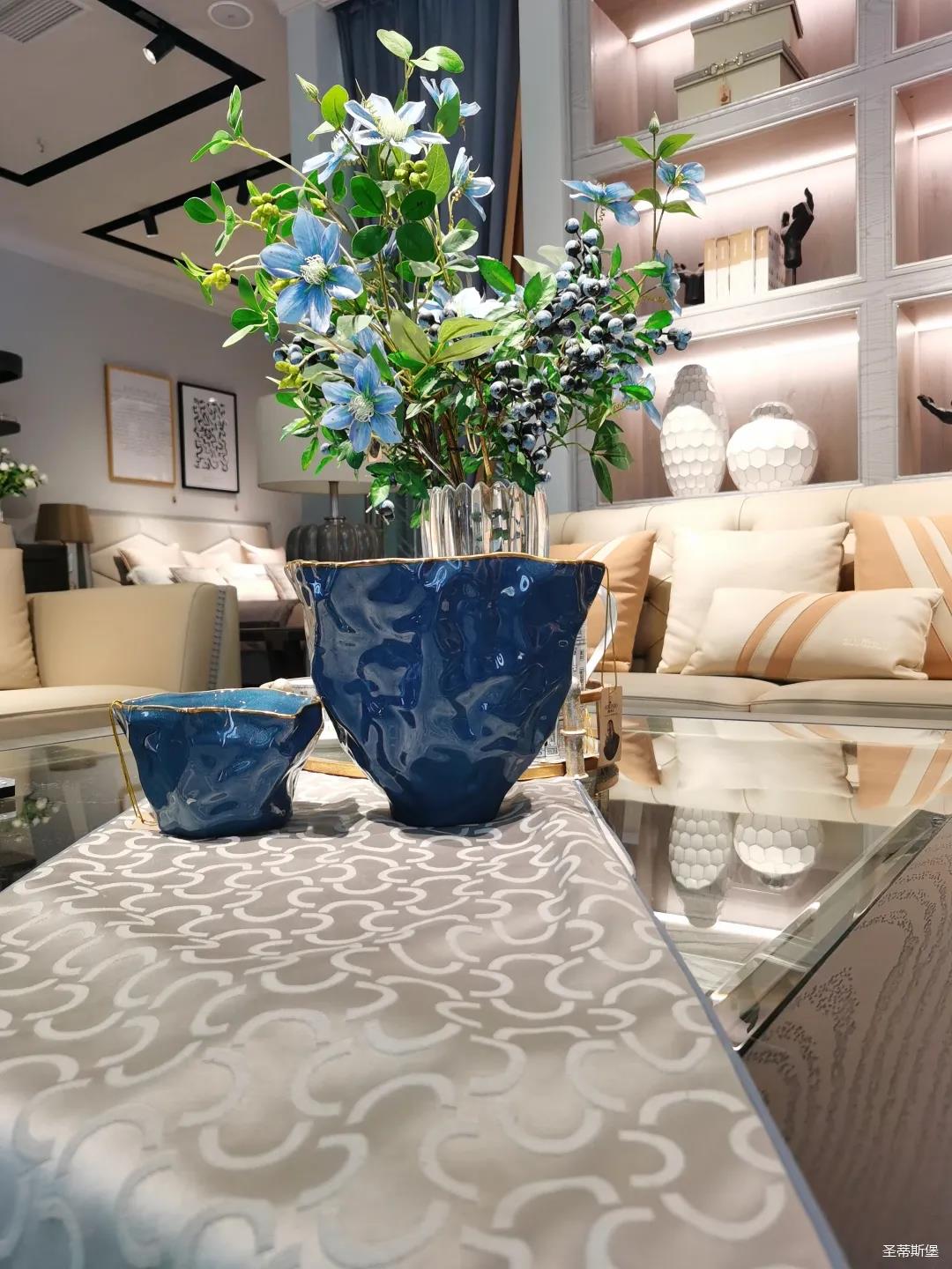 器口形状各异,摒弃了传统陶艺的方圆设计,引领中西结合陶艺的时尚特性,金边镶嵌,运用瓷器染色工艺,由深至浅洗染,以分明暗转折。